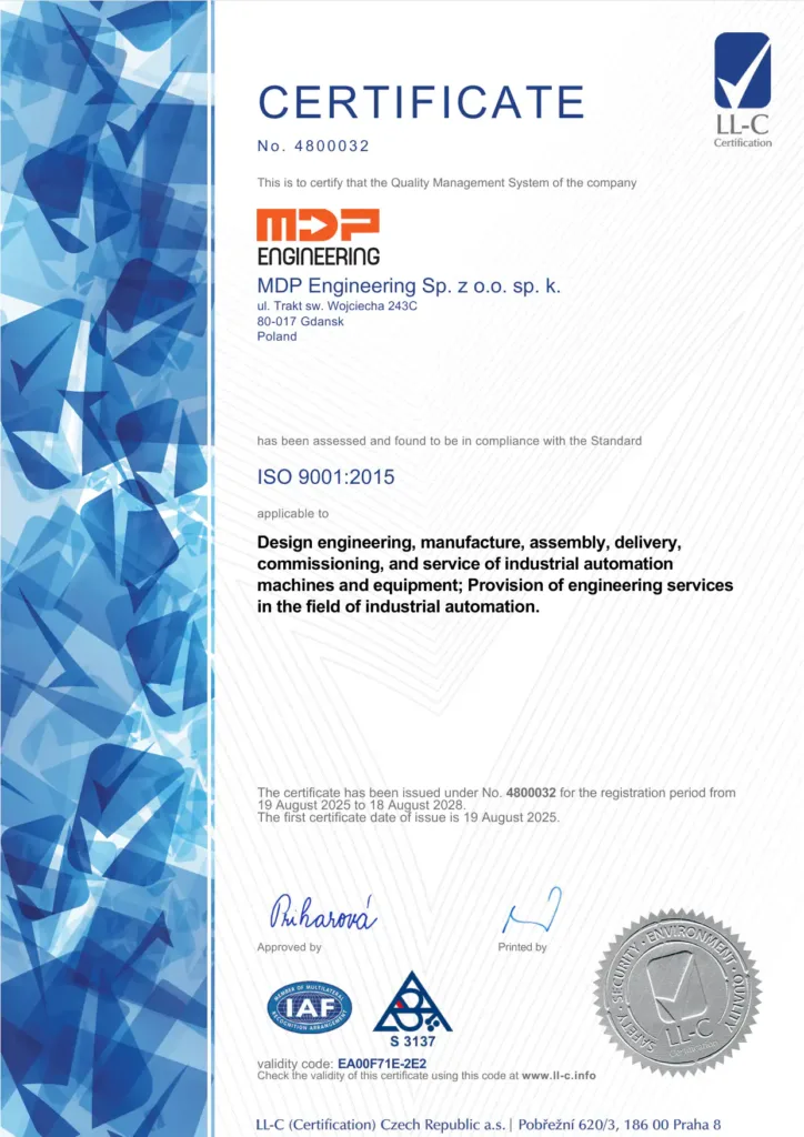 Wir freuen uns, mitteilen zu können, dass das Unternehmen MDP Engineering nach der Norm ISO 9001:2015 zertifiziert wurde. Das Zertifikat umfasst unsere spezialisierten Dienstleistungen in der Planung und dem Bau von Produktionslinien, der Automatisierung industrieller Prozesse, der SPS-Programmierung sowie der Implementierung robotisierter Arbeitsplätze. Verliehen von der unabhängigen Zertifizierungsstelle LL-C (Certification), bestätigt dieses Dokument die Anwendung höchster Standards im Qualitätsmanagement im Bereich der Ingenieurleistungen für industrielle Automatisierung.