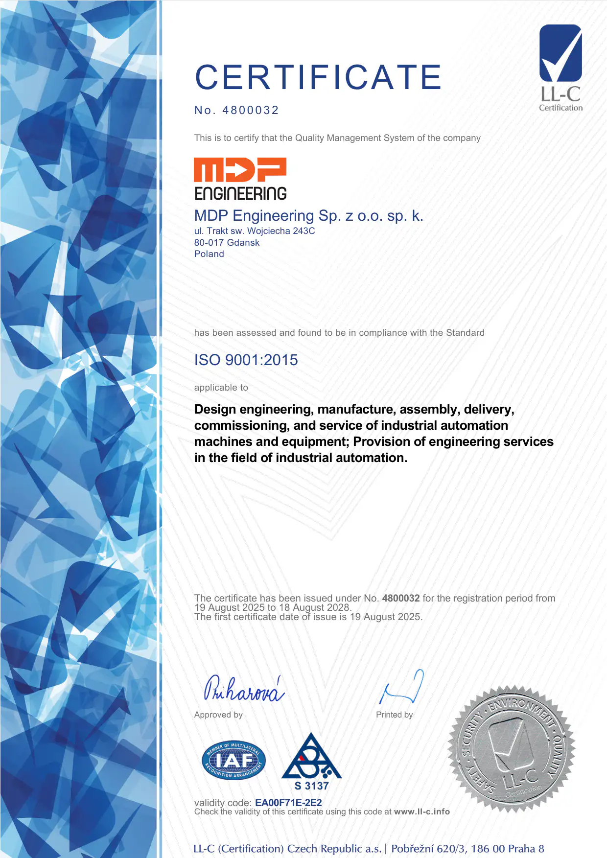 MDP Engineering holds the ISO 9001:2015 quality certificate, issued by the independent certification body LL-C (Certification). It covers the design and construction of production lines, industrial process automation, PLC programming, and the implementation of robotic workstations. This certification confirms that our design procedures, execution processes, and quality control meet strict European standards and align with best industry practices. We undergo regular audits to ensure the highest quality of our services, workplace safety, and compliance with regulations. This guarantees our clients that they are working with a company of proven competence and reliability.