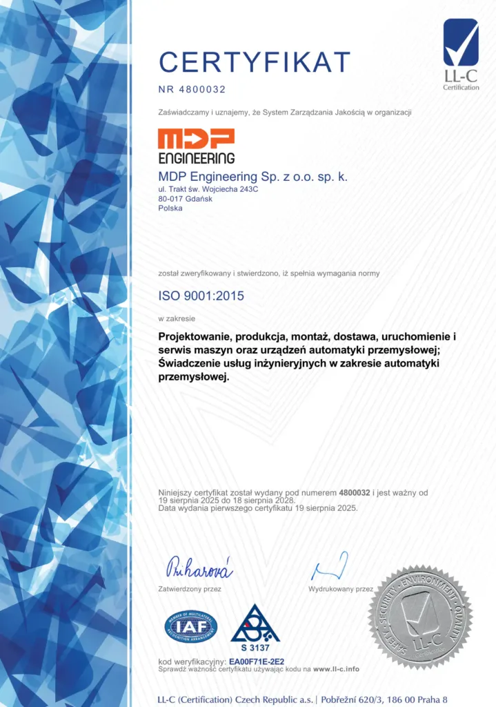 Z dumą informujemy, że firma MDP Engineering została certyfikowana zgodnie z normą ISO 9001:2015. Certyfikat obejmuje nasze specjalistyczne usługi projektowania i budowy linii produkcyjnych, automatyzację procesów przemysłowych, programowanie sterowników PLC oraz wdrażanie zrobotyzowanych stanowisk pracy. Przyznany przez niezależną jednostkę certyfikującą LL-C (Certification), dokument ten potwierdza stosowanie najwyższych standardów zarządzania jakością w obszarze inżynierii automatyki przemysłowej.